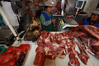 Alpacas resemble small llamas and are very common in Peru. You can buy Alpaca sweaters, hats and socks at every market and Alpaca steaks are on the menu at every restaruant in town. I had it for the first time in a pineapple stirfry and it was delicious. In the market you could buy their heads, hearts and I´m sure alot of other parts I didn´t recognize. Check out their heads and hearts on the left in the pic below!